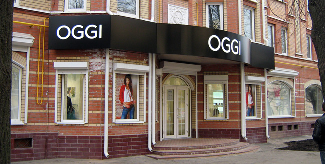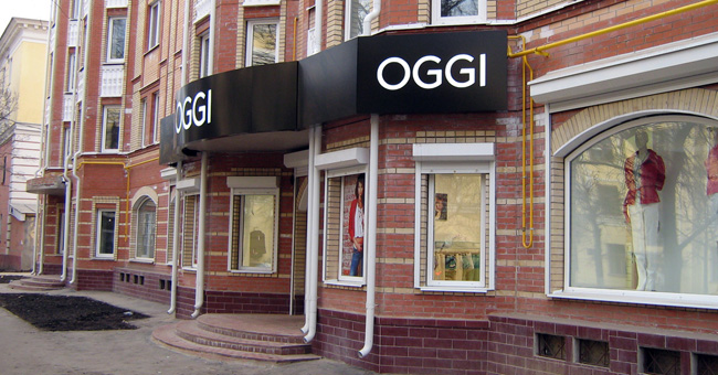 Подсветка прорезных букв выполнена стандартной люминесцентной электрик ой Philips, однако способ ее крепления внутри световых коробов— оригинальный, он несколько сложнее в сборке, зато в разы удобнее при замене электрики. Не секрет, что многие вывески «гаражного» исполнения по своей сути являются одноразовыми и никогда обычный шабашник не предполагает длительной эксплуатации вывески (например, до перегорания ламп). Соответственно, ремонт с банальной заменой одной-двух ламп для такой вывески часто означает её полную разборку и последующую сборку (если получится), что выливается в значительную сумму, иногда сравнимую с выплатами такому «специалисту» за изготовление одноразовой вывески. В вывеске OGGI изначально предусмотрено удобство ремонта: электрика установлена на съемных кассетах, целиком меняемых при снятии верхней крышки. (подобная хитрость применяется почти во всех световых вывесках нашей фирмы, т.к. чаще всего именно нам поручают сервисное обслуживание рекламы, а создавать самим себе проблемы в будущем — явно не логично).