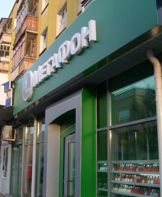 Пожалуй, один из самых технологически сложных проектов — фасадная вывеска и входная группа, выполненные нами для офиса продаж ОАО «Мегафон» в Йошкар-Оле: не часто встретишь работу, в которой одновременно присутствуют цельноклеенные акриловые объемные буквы, боковая засветка поверхностей, двусторонняя зеркальная печать и тонирование лицевых панелей, цветной неон, сложные выкройки композита и его гибка по радиусам, не говоря уж о полимерной окраске в фирменный цвет профильной алюминиевой системы светового короба.