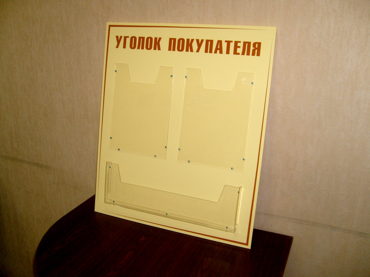 Уголок покупателя с двумя карманами под листы формата А4 и карманом для брошюр А5-го формата